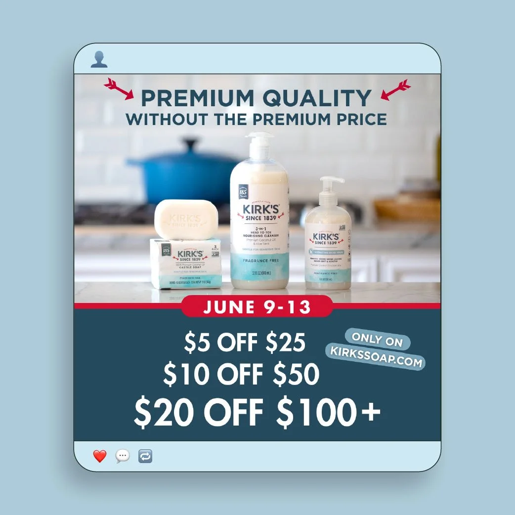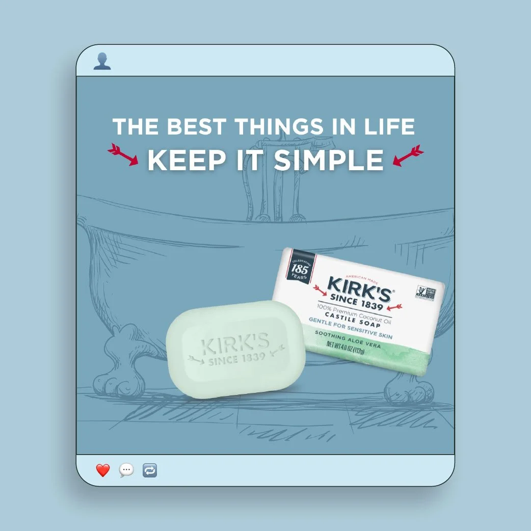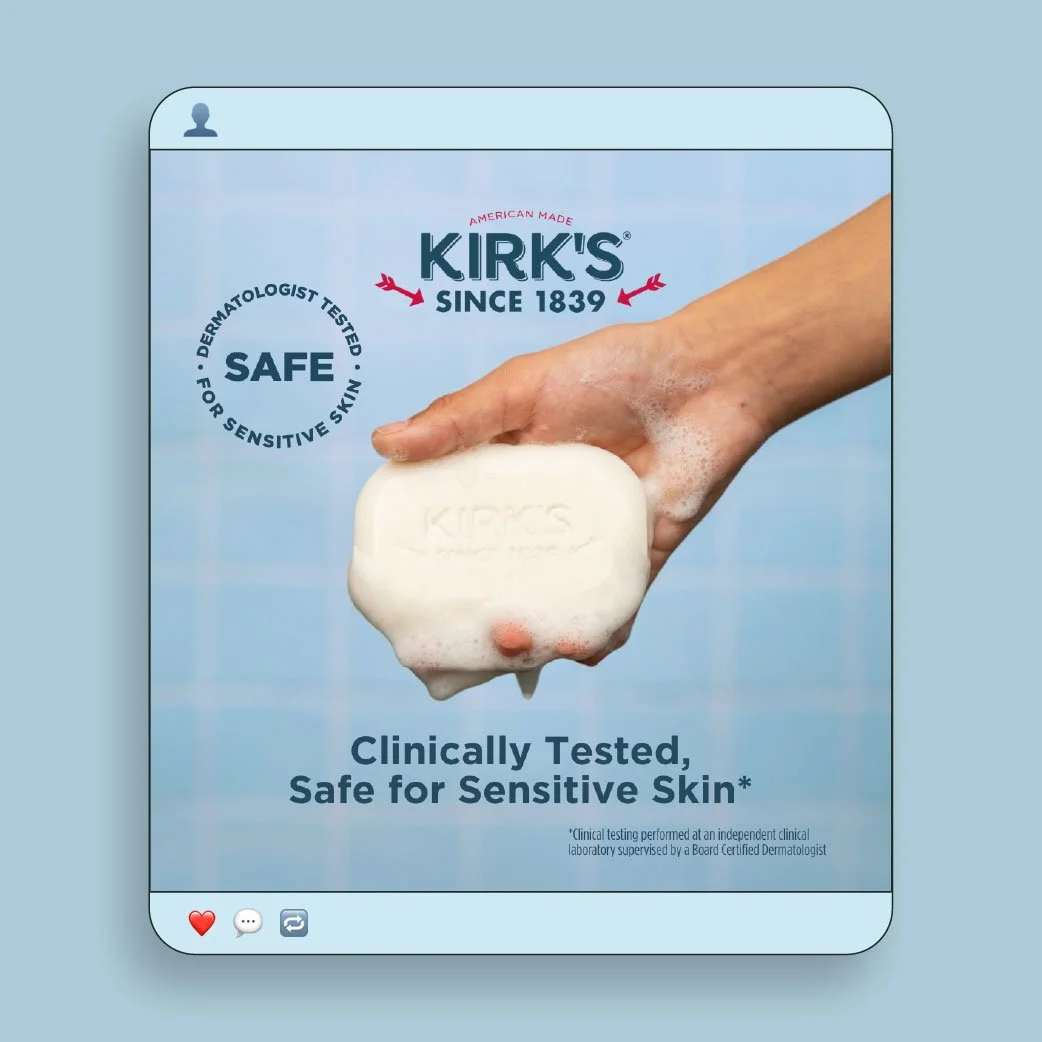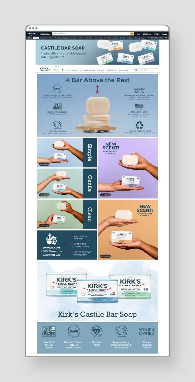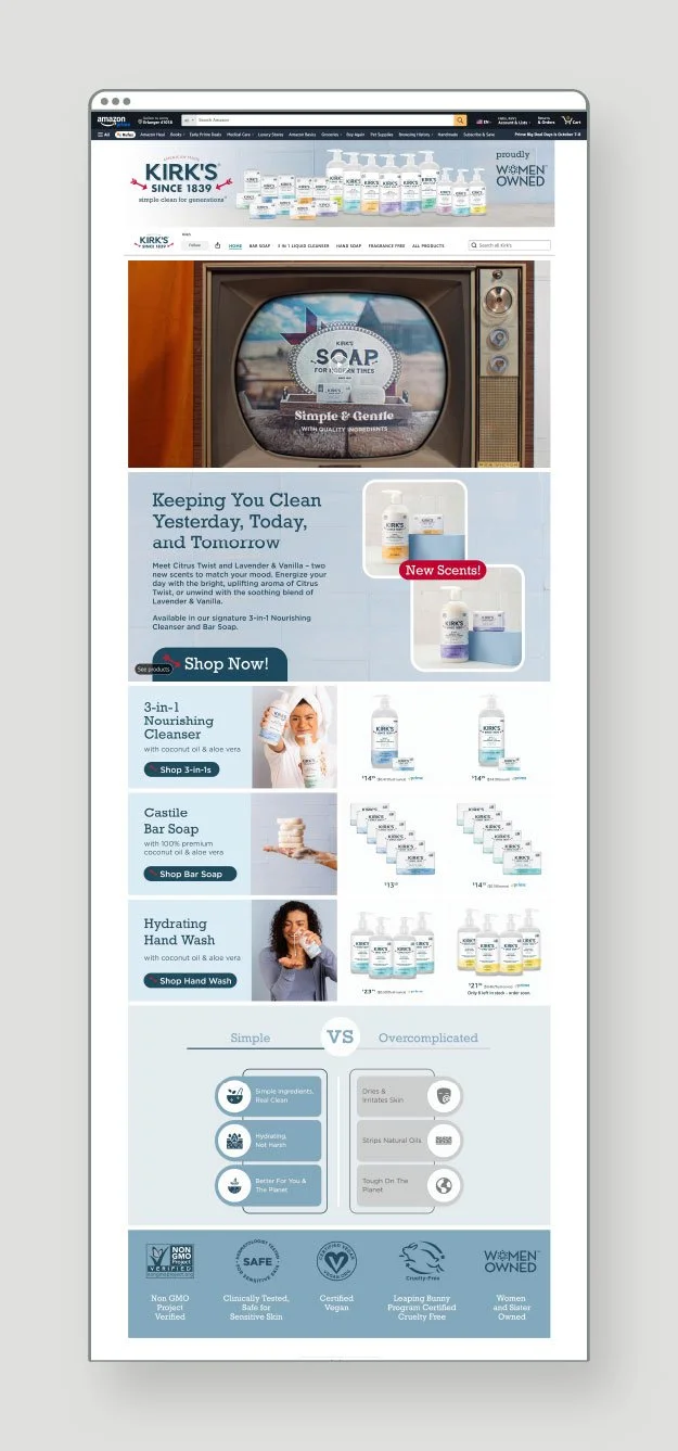 The Soap for Modern Times campaign delivered Kirk’s biggest brand moment, spanning paid media, organic social, DTC, and retail. By extending Raindrop’s creative into additional formats, I helped the campaign reach new audiences wherever they encountered Kirk’s — whether scrolling social, browsing Amazon, or shopping on our website. The result was a campaign that not only looked polished but felt consistent and true to the Kirk’s voice across every channel.