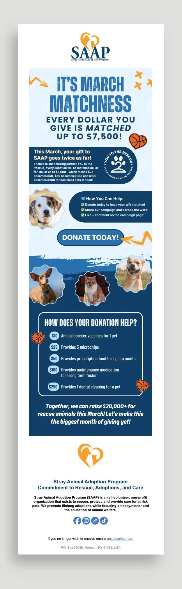 With the website in place, I then created branded email templates and social graphics that helped unify their look across platforms. Together, these updates made it possible to run year-round digital campaigns—like Giving Tuesday, March Matchness, Poorly Drawn Pets, and Super Bowl Squares—that bring in more donations and keep supporters engaged.