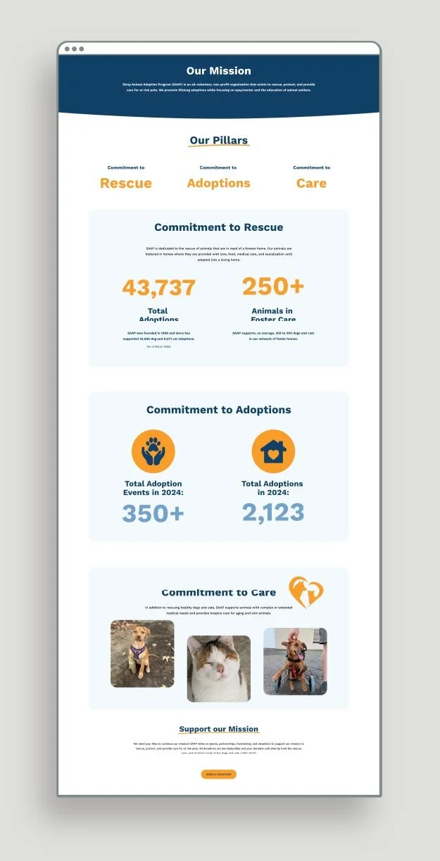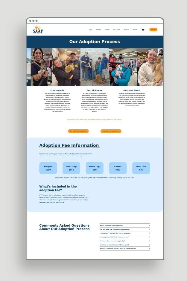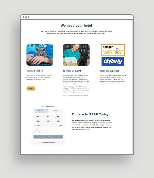 SAAP’s old WordPress site had grown messy over the years. Information was scattered, pages were out of date, and the adoption process was confusing. Donations were limited to PayPal, which made it harder for people to give—and nearly impossible to track campaigns or recurring gifts. On top of that, branding felt inconsistent across the website, emails, and social media, making it tough to build momentum with supporters.