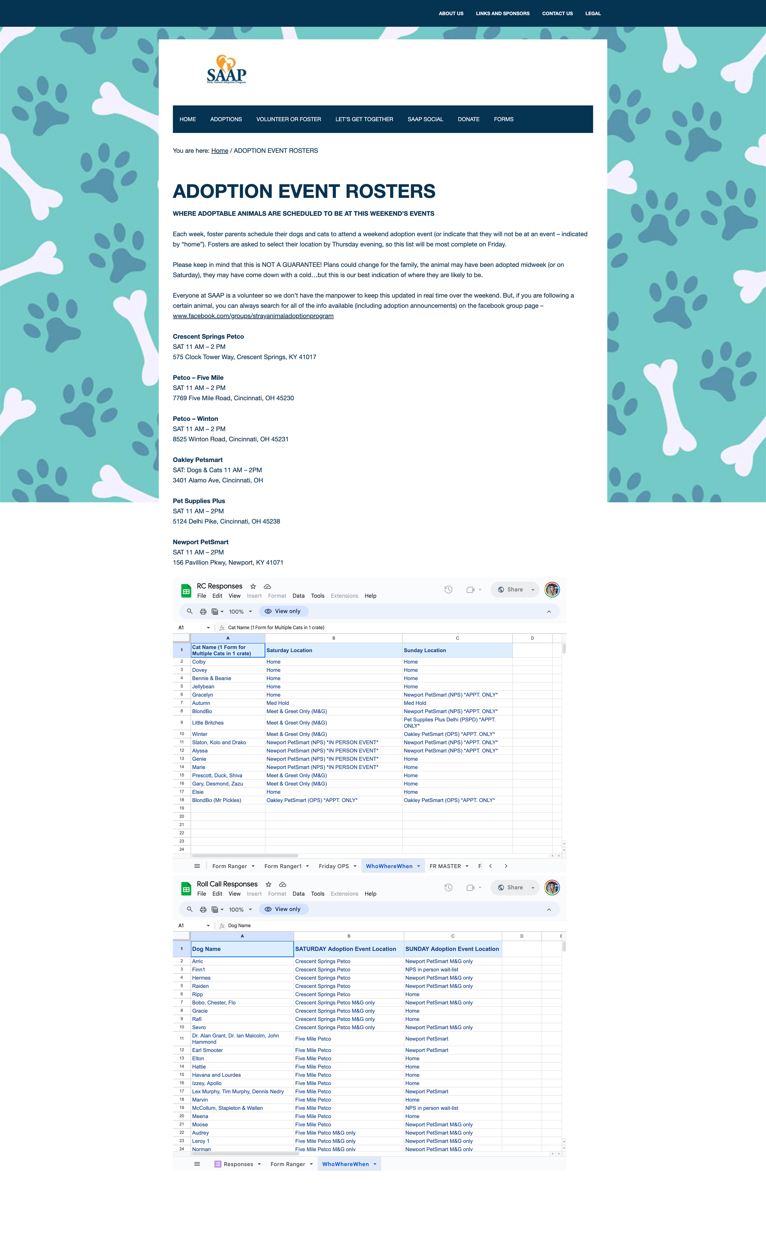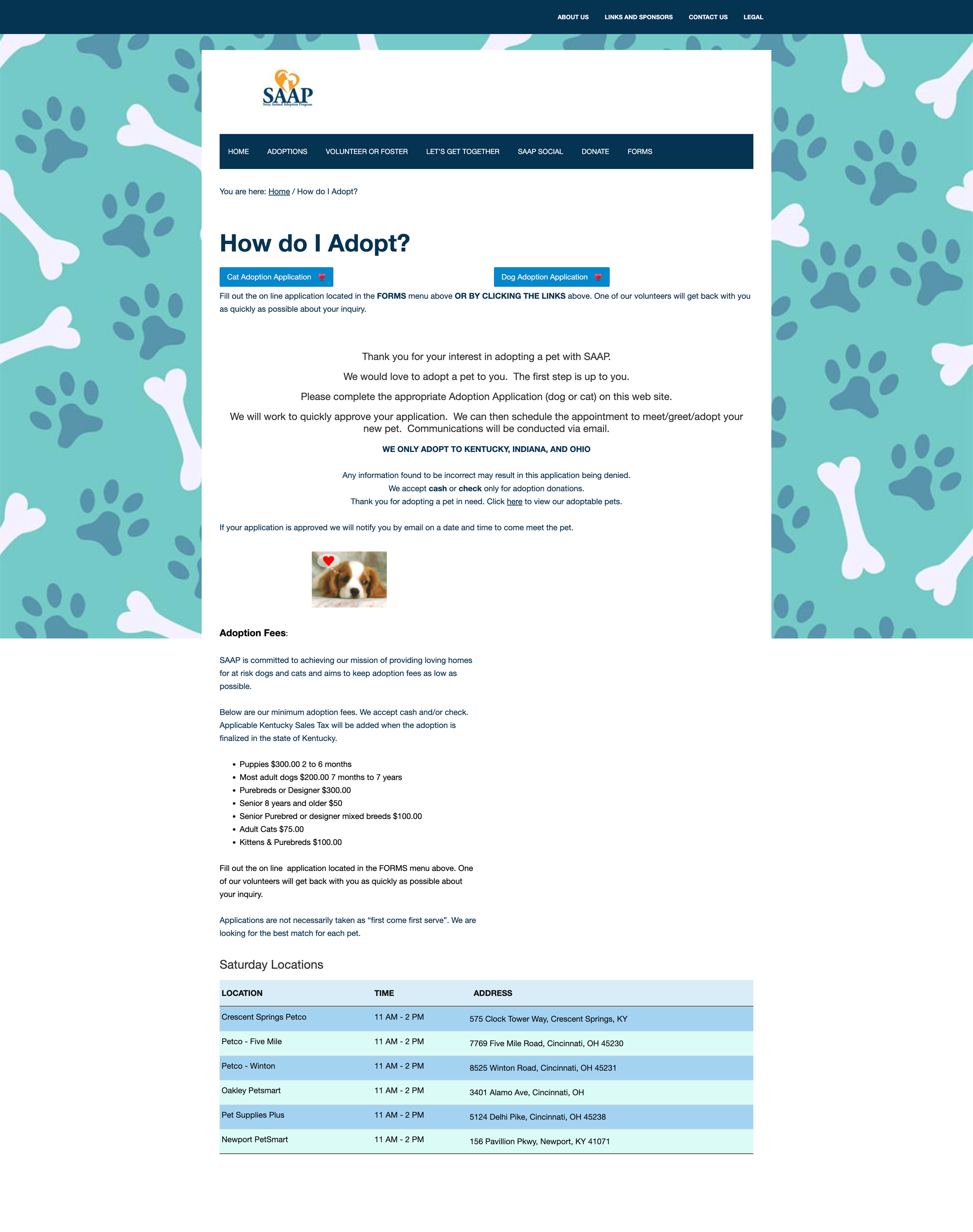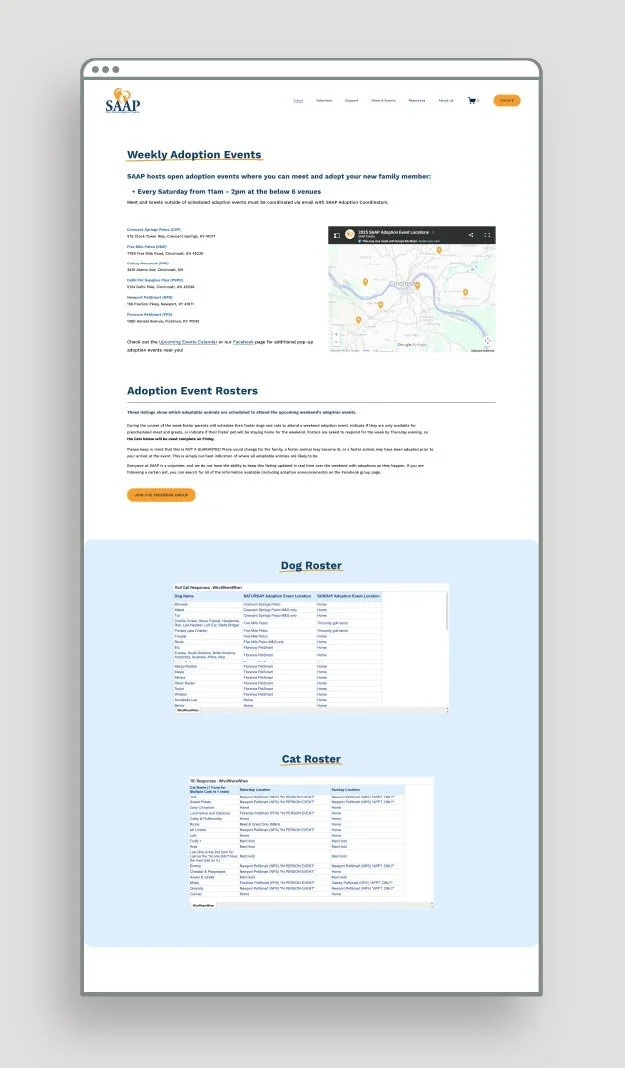SAAP is one of the largest foster-based rescues in the Greater Cincinnati/Northern Kentucky area. Their old WordPress site and donation system were hard to use, scattered, and not built for growth. I stepped in to give them a full digital refresh: moving their website to Squarespace, setting up Givebutter for donations, and building out email and social campaigns.