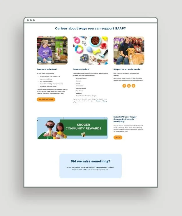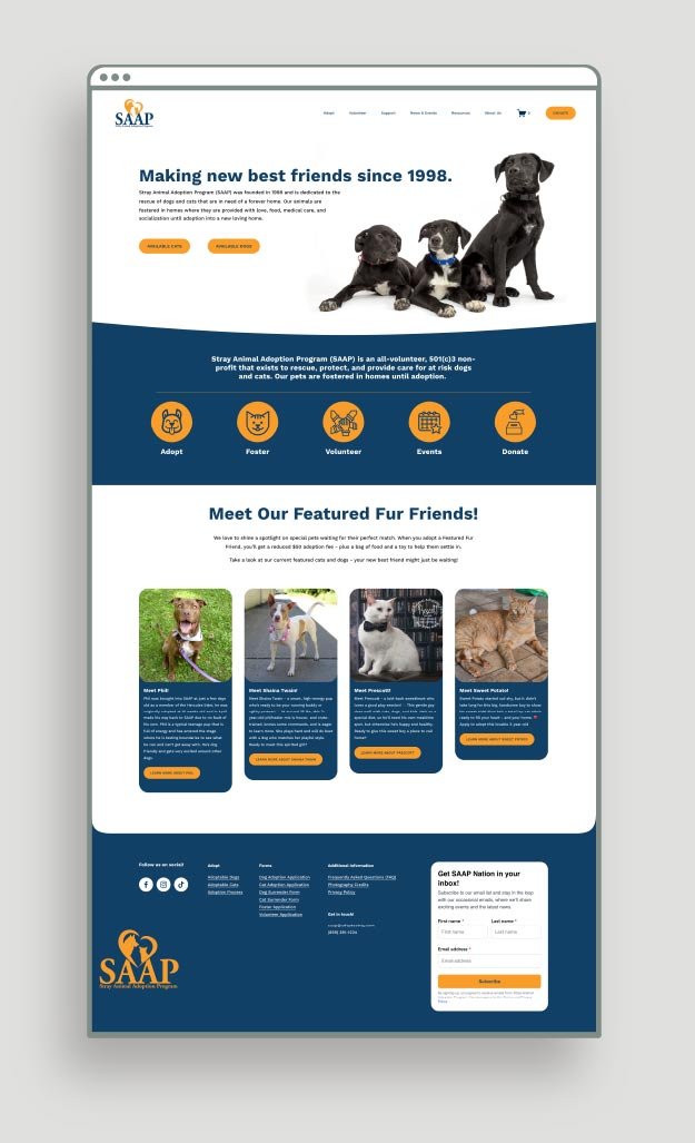The mission was clear: create a modern, easy-to-manage digital home for SAAP that made adopting, fostering, and donating simple. At the same time, we wanted to expand how SAAP connected with supporters—through streamlined donation options, creative fundraising campaigns, and consistent branded communications. Everything needed to feel approachable, mobile-friendly, and built to grow with the rescue.